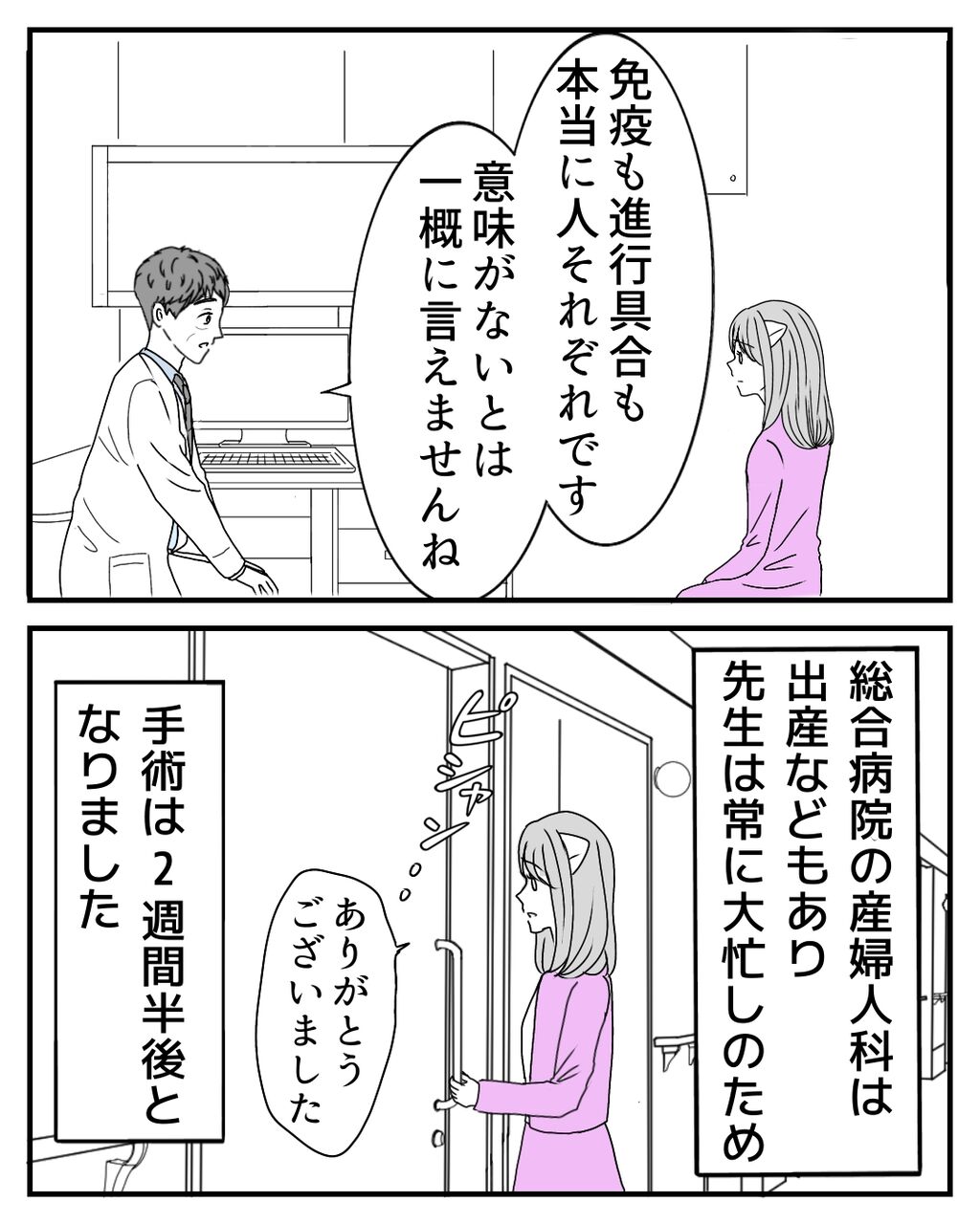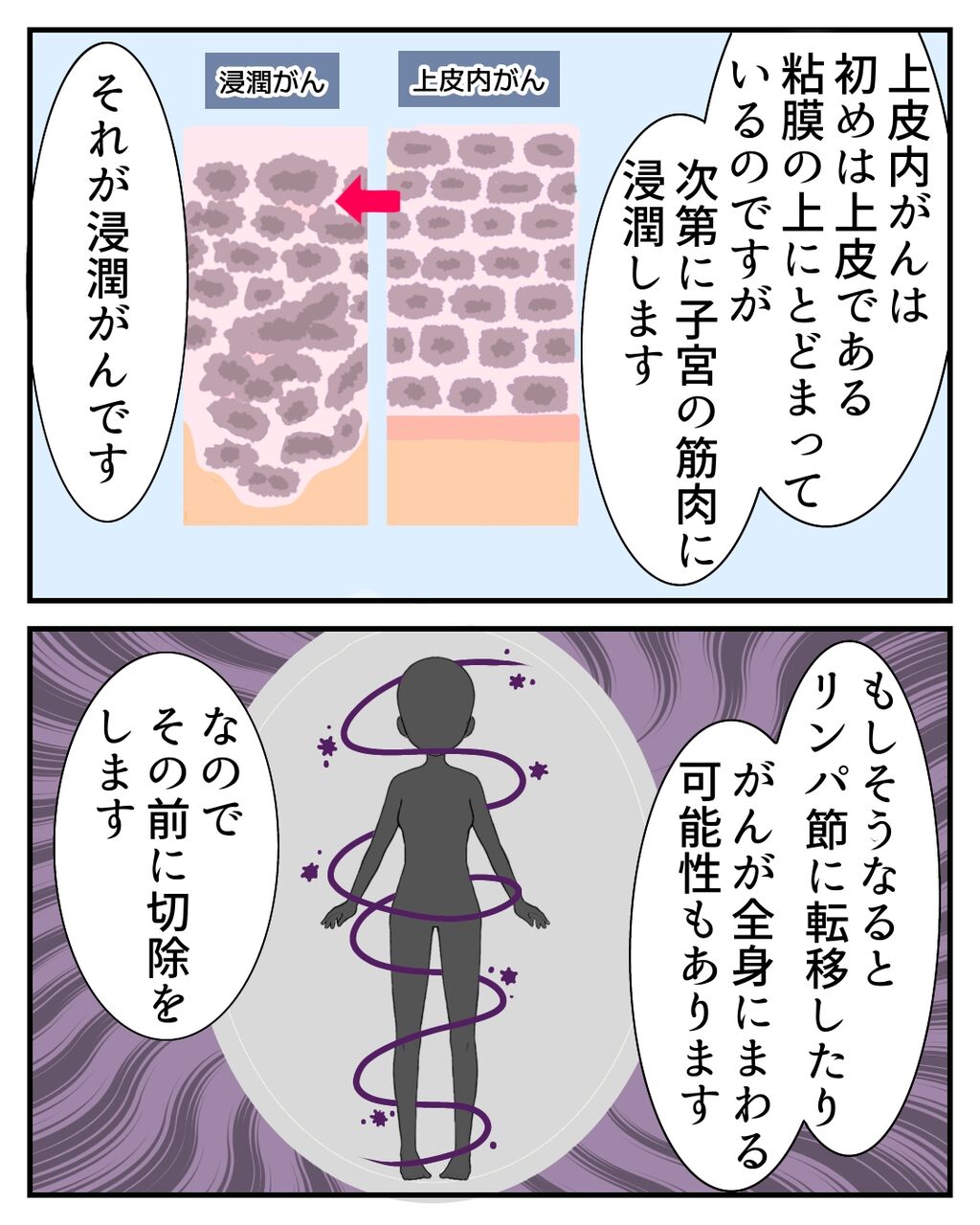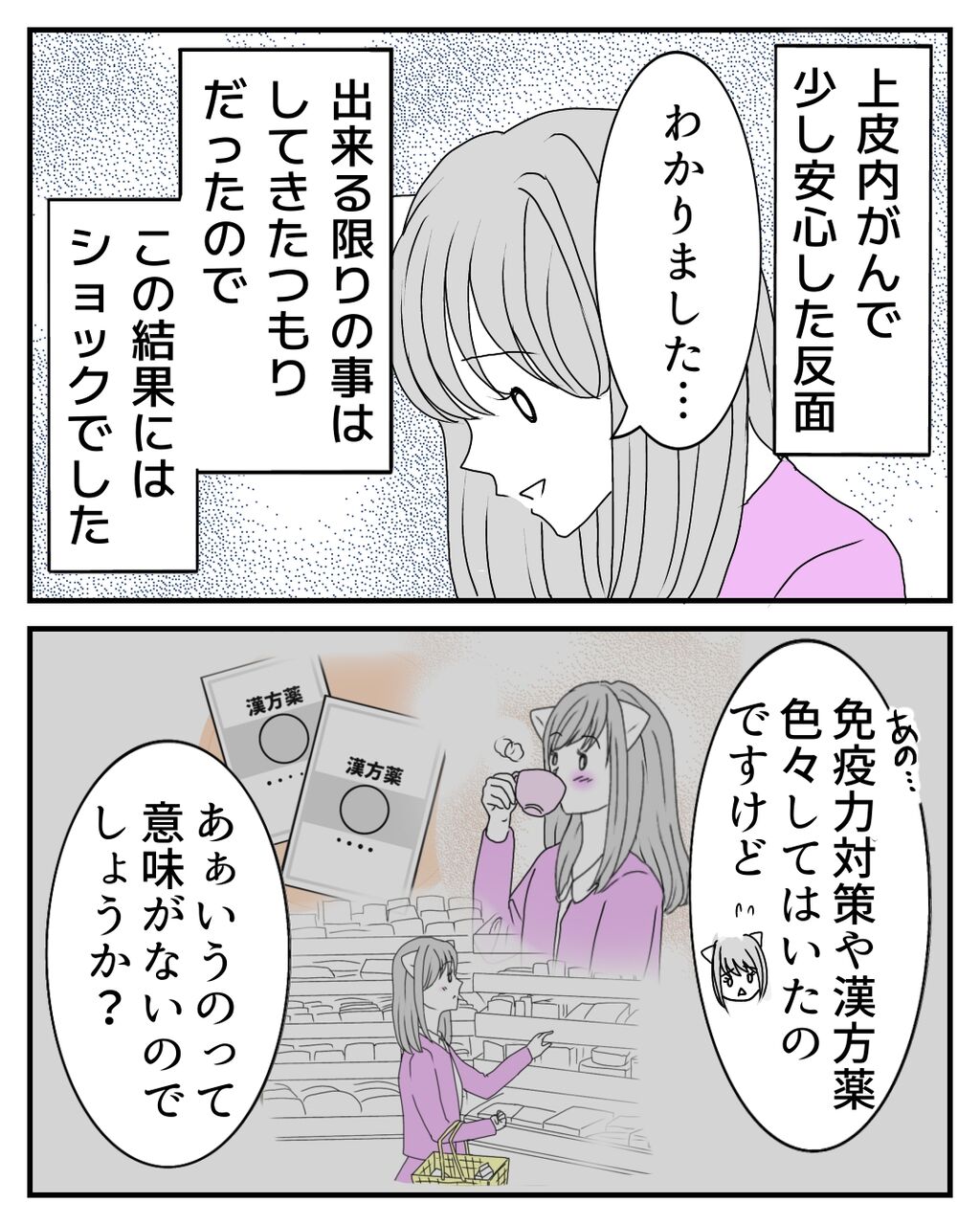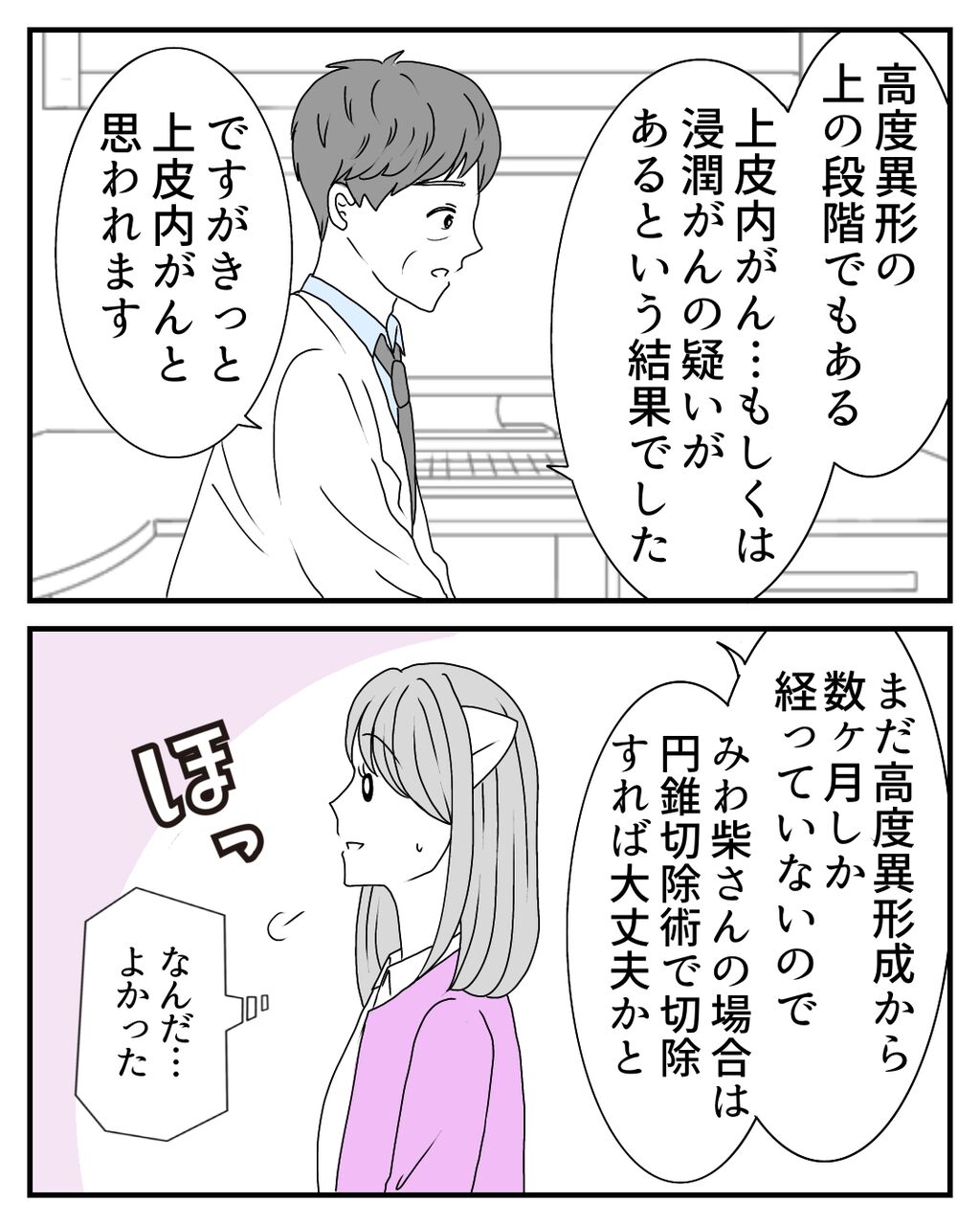 いつもより健康的な生活を心がけていましたが、高度異形成から3ヶ月で上皮内がんに進行したのです。以前の先生からも上皮内がんは場合によって子宮全摘が第一選択になるという話は聞いていたため、現在の先生に私の場合は円錐切除で大丈夫と言われて、この時は安心しました😮💨