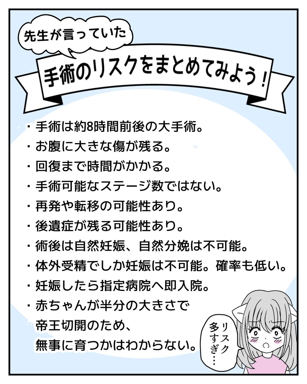 医療知識や費用など、専門的なことは詳しくはわかりません。あくまで患者側の個人の体験談です。なので、患者からみた病気との葛藤や心情、人間模様を私らしく描いていきたいと思っています。病気の家族や友人への接し方など、参考になったら嬉しいです✨