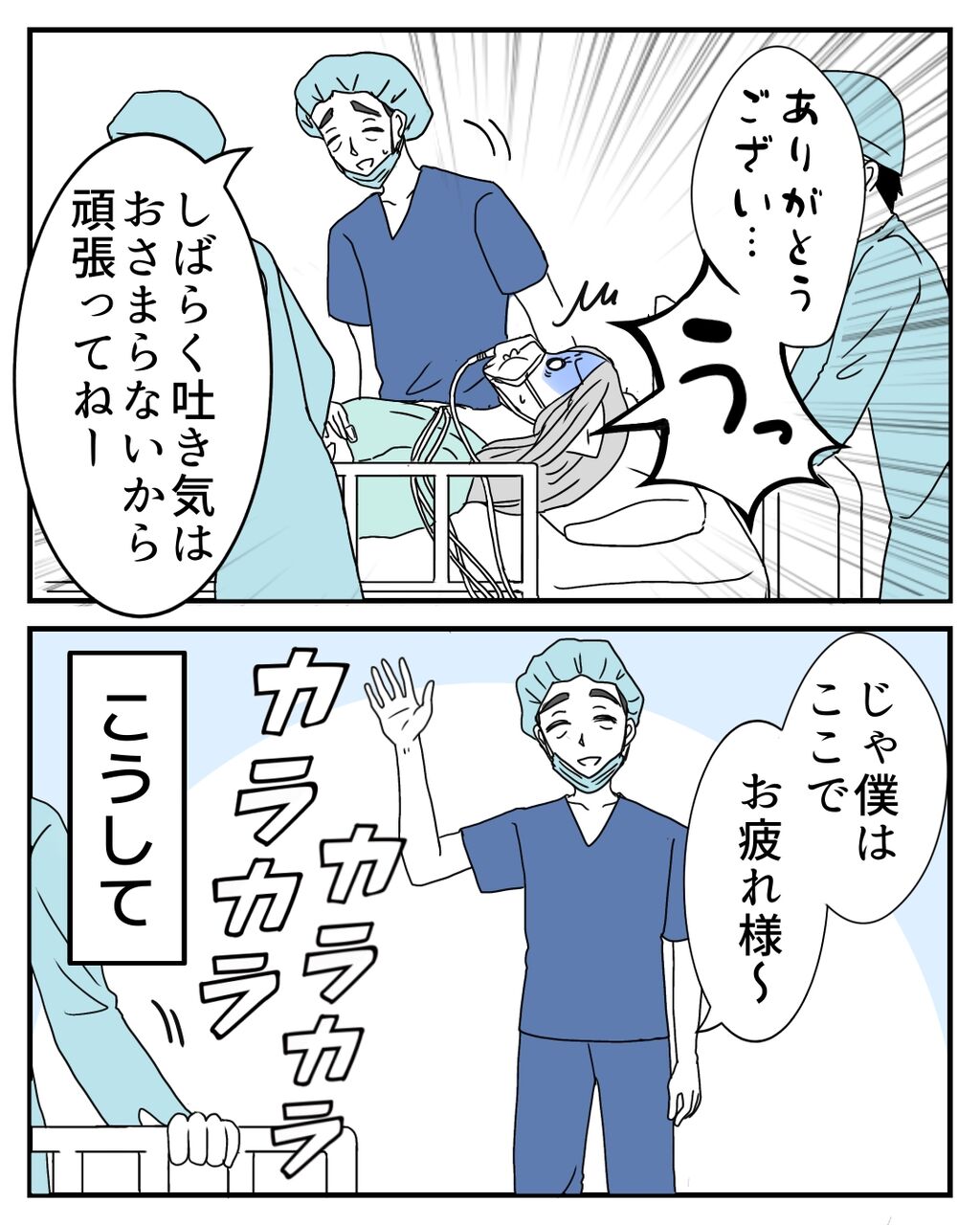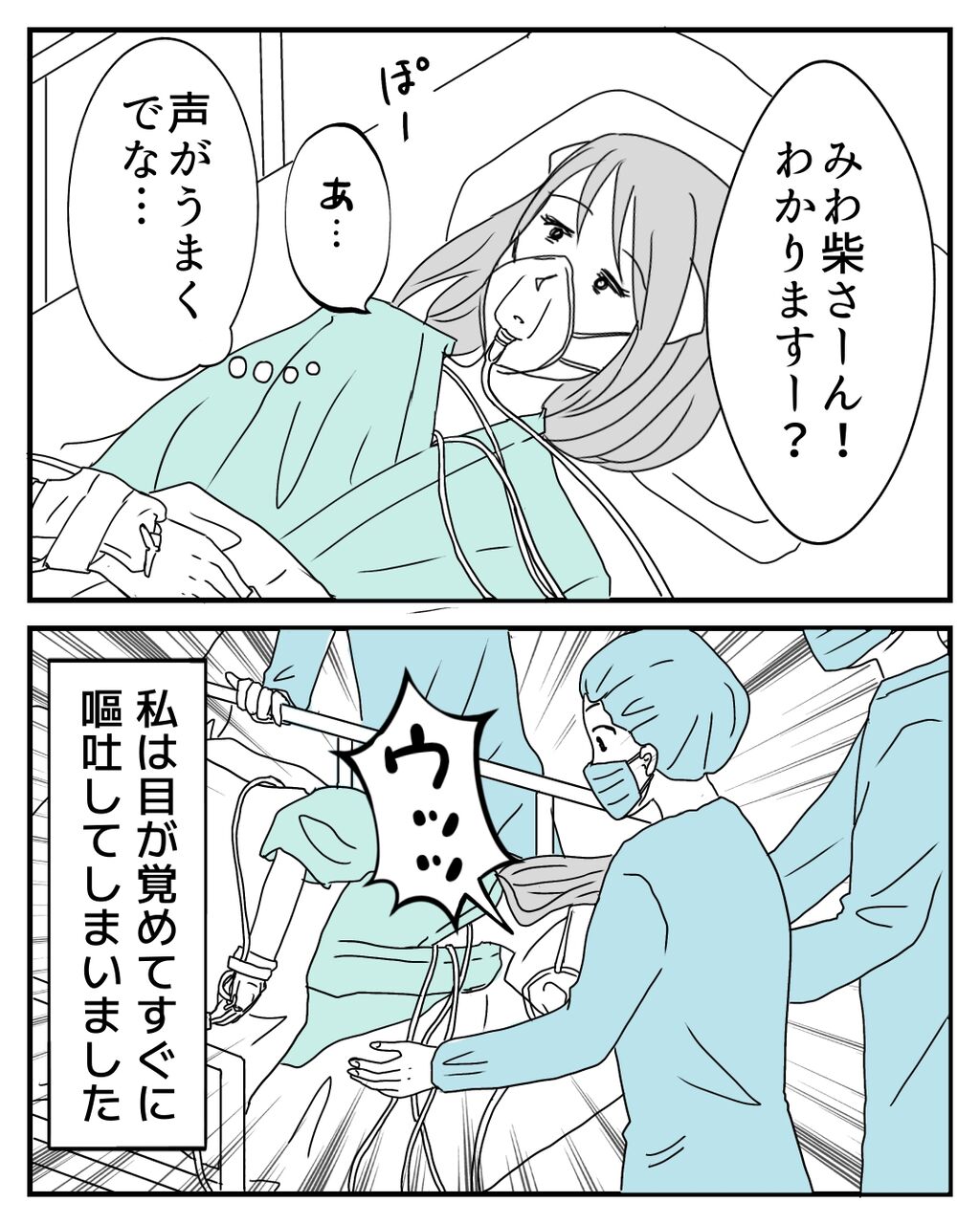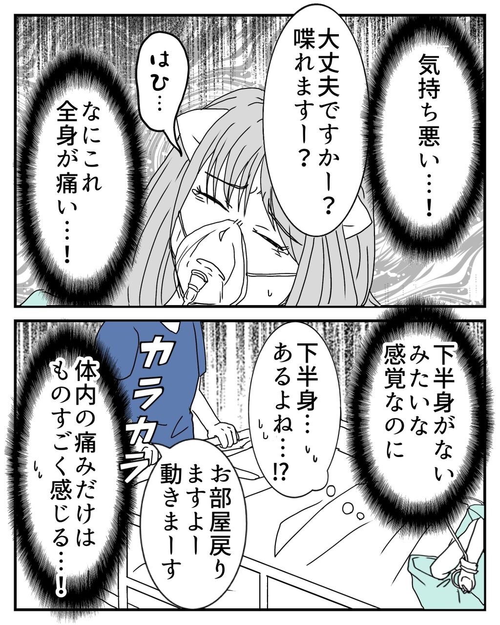 術後は全く下半身には力が入らず、体がないような感覚ですが、体内の痛みがとんでもないです😭何より私は吐き気がすごく、手術室から出て病室に戻るまでの間、何度も嘔吐してしまいました。術後の様子も人それぞれですが、私の場合を描いていきます☺️