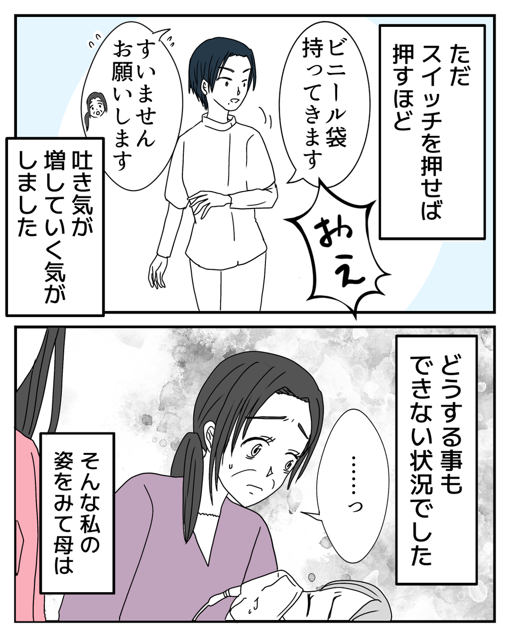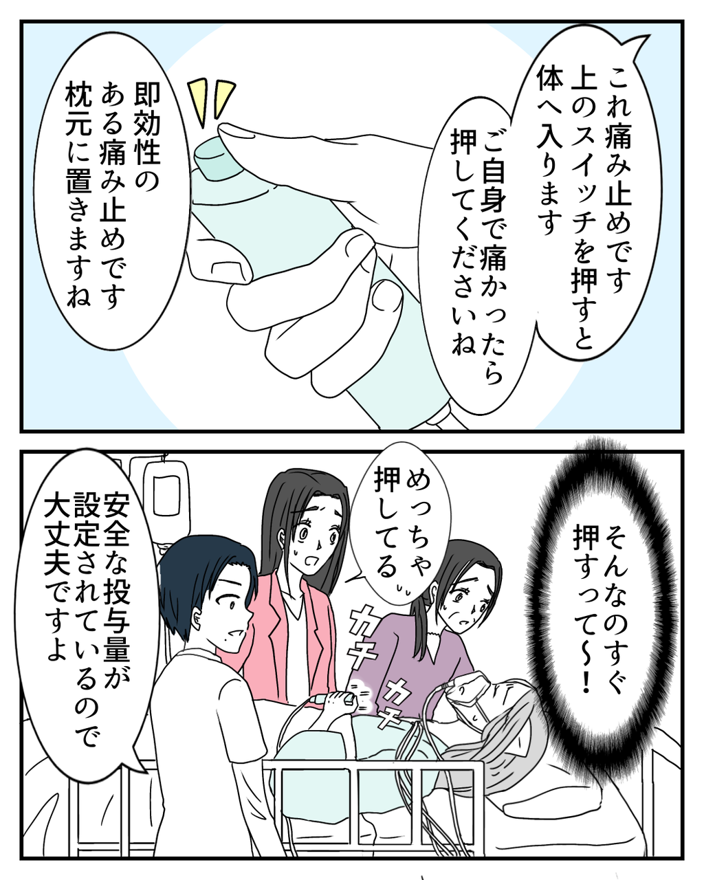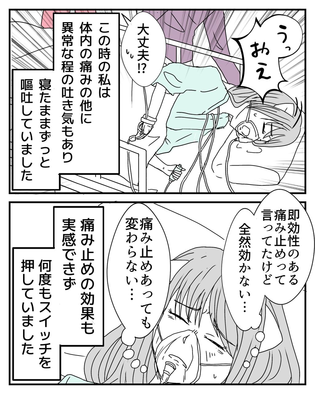 麻酔科の先生に説明を受けてはおりましたが、想像以上でした。嘔吐しても何も出ることはなく、胃液が出るだけ。おそらく痛み止めとの副作用で、更に吐き気は増していき、もう痛みと吐き気でどうする事もできず、どちらをとるにもとれない状況💦