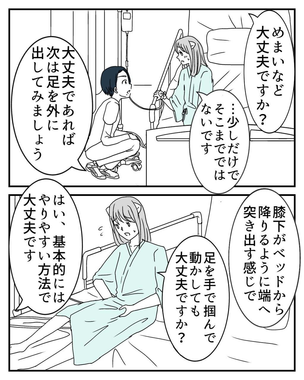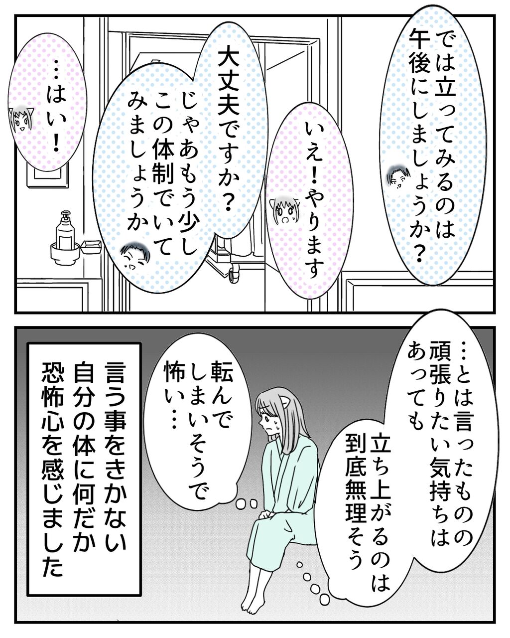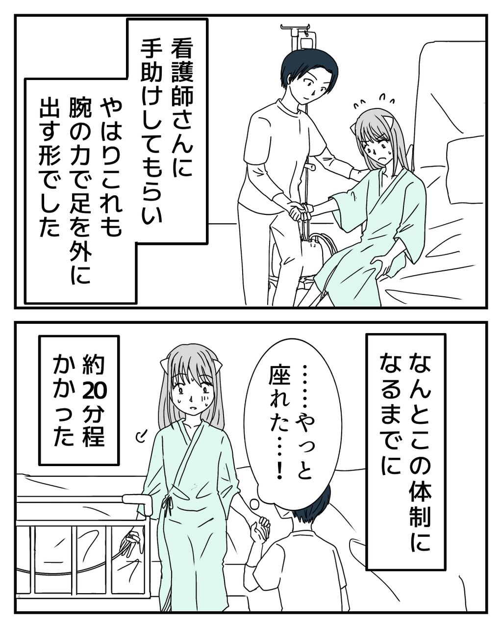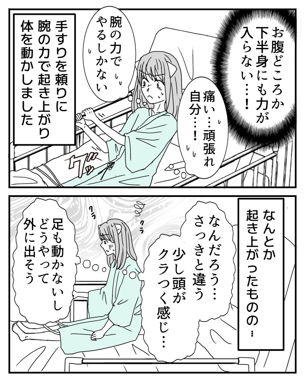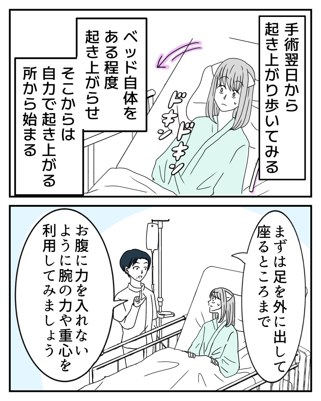 漫画では伝わり切らないかもしれませんが、術後翌日からの起き上がるリハビリはとてもガッツがいりました。ただ、早く元気になりたい一心と初めての恐怖心で、どこか焦りもあり、少し無理をしてしまったところは正直あります💦ここから更に立ち上がって歩き出せるのでしょうか?