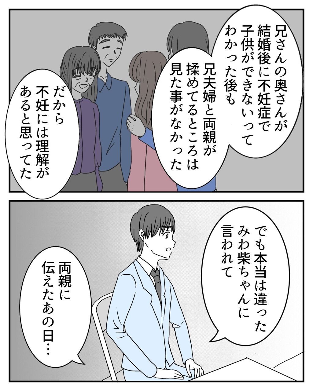 お兄さん夫婦は不妊を理解してもらえましたが、ユウくんが話すと私については理解を得ることはできませんでした。その理由はユウくんのお父さんが話してくれたそうなのですが…。