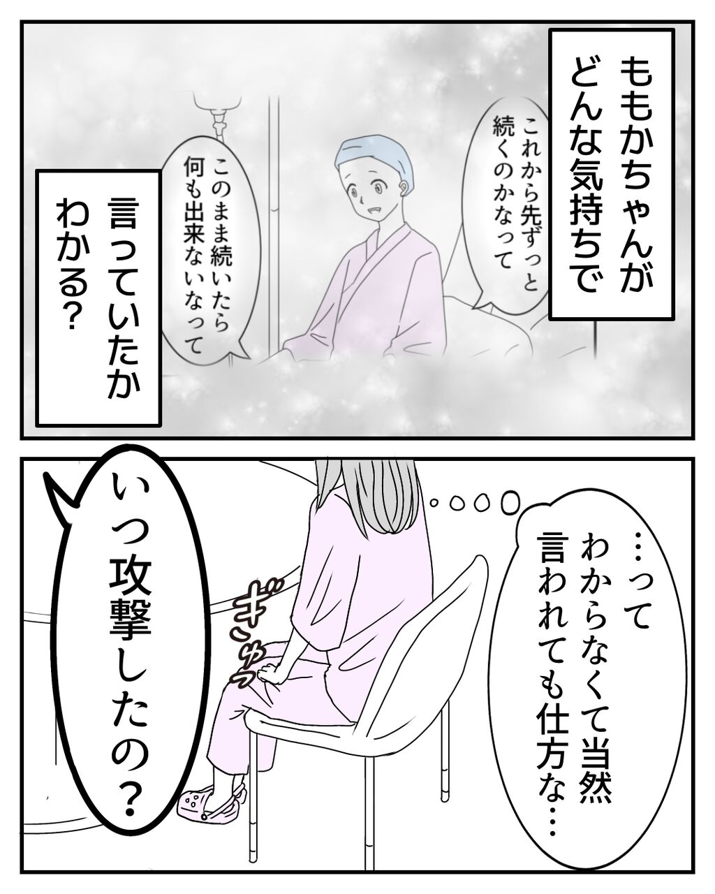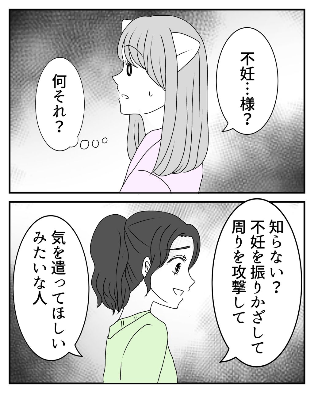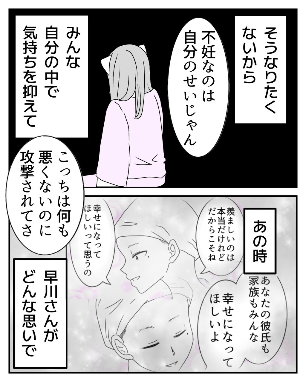 みどりちゃんは幼い頃からの親しい友人で、物事をハッキリ言う子なのですが、私は「不妊様」という言葉をここで初めて知りました。そんな言葉があること自体、私は知りませんでした💦あまりいい言葉ではないですよね。そのような差別用語が存在することがとても悲しかったです😢自分だけではなく、他の患者さんとも触れ合ったからこそ、悔しい気持ちになりました。