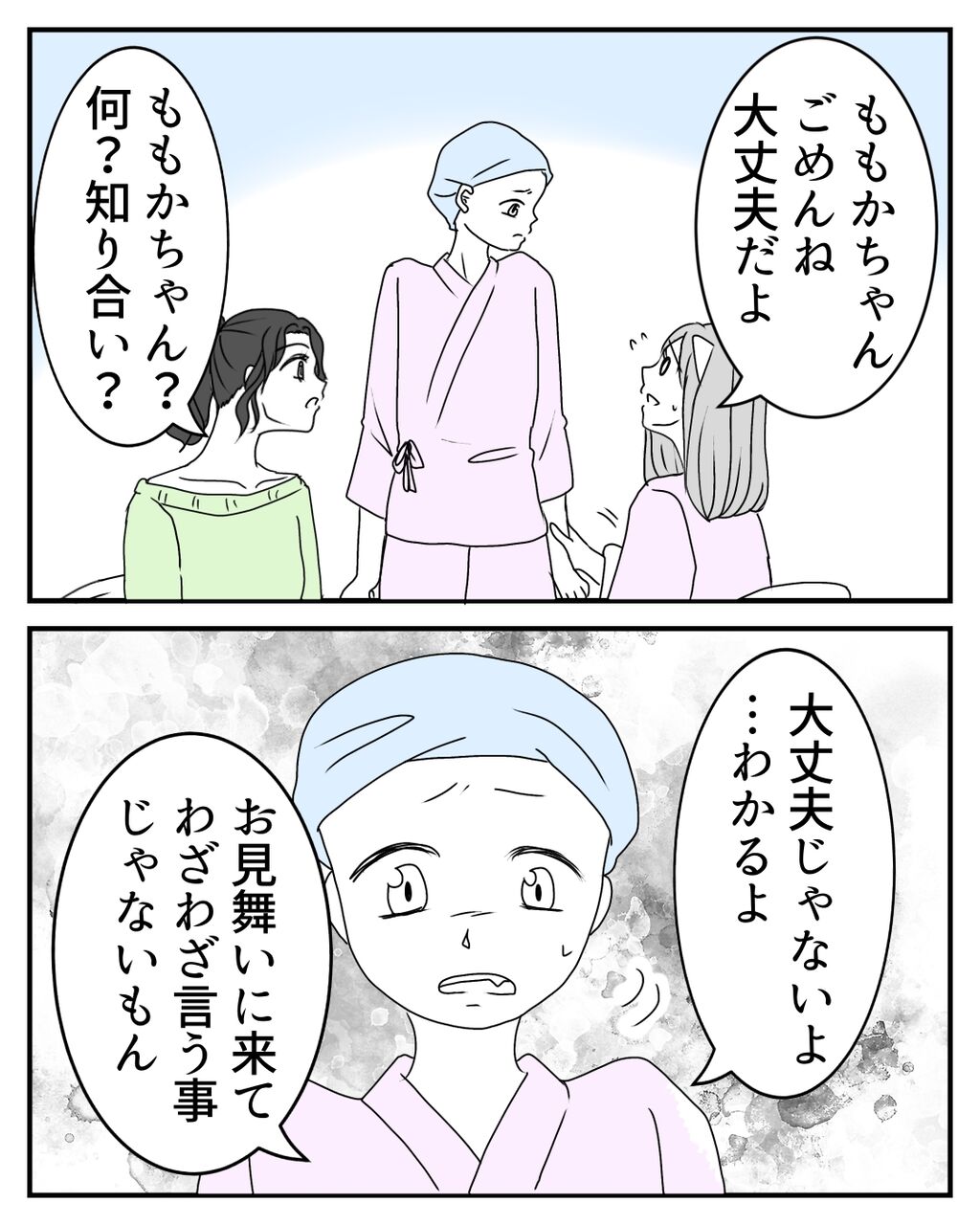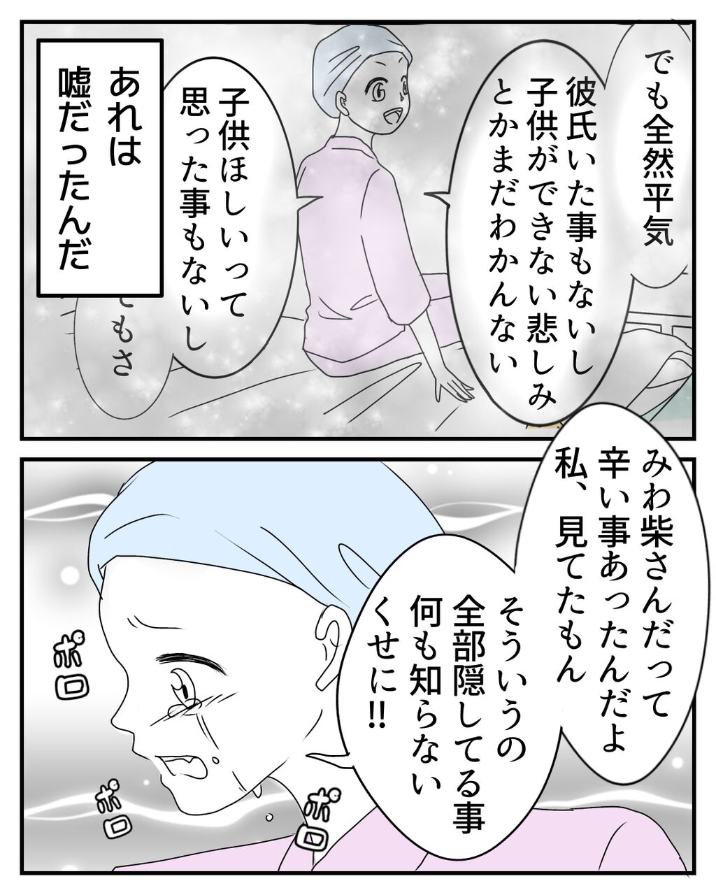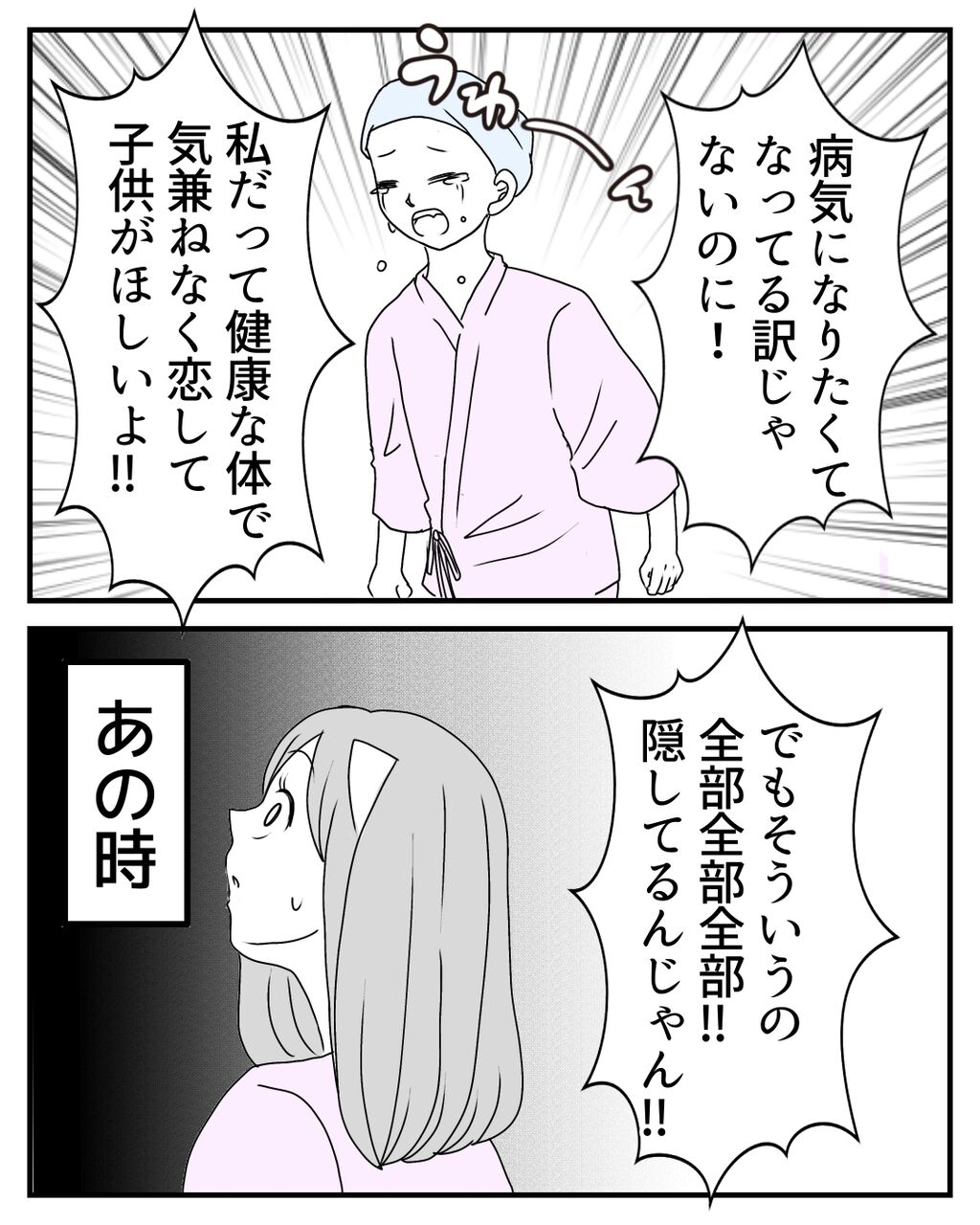私は不妊様という言葉をこの時初めて知りましたが、ももかちゃんは前から知っているようでした。私ががんになるよりも前から、病気と長く闘っていたももかちゃんにとって、許せない言葉だったのだと思います。私には恋人や子供について、ほしいと思った事がないから気にしていないと以前お話して(78話)いましたが、あれは嘘で、そんな自分を隠していたのでした…。そんなももかちゃんの気持ちも届かず、心無いみどりちゃんの発言に私は…。